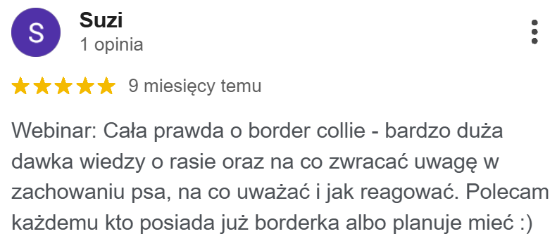 "Super webinar, sporo wiedzy teoretycznej ale też praktycznej. Przeznaczony dla właścicieli borderów ale też osób interesujących się tą rasą. Ogólnie polecam :)"